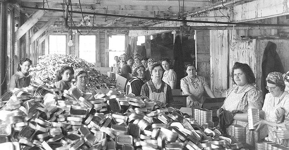 There was very little automation in the factories so each can of sardines was handled several times by workers before being finally shipped to market. Thousands of cans are waiting above at the Wilson factory in Eastport to be boxed. Photo by St. Croix Historical Society